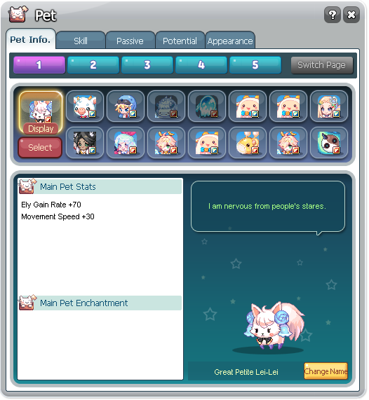 ▷ Pet pages can only be switched from the Info. and Potentials tab.