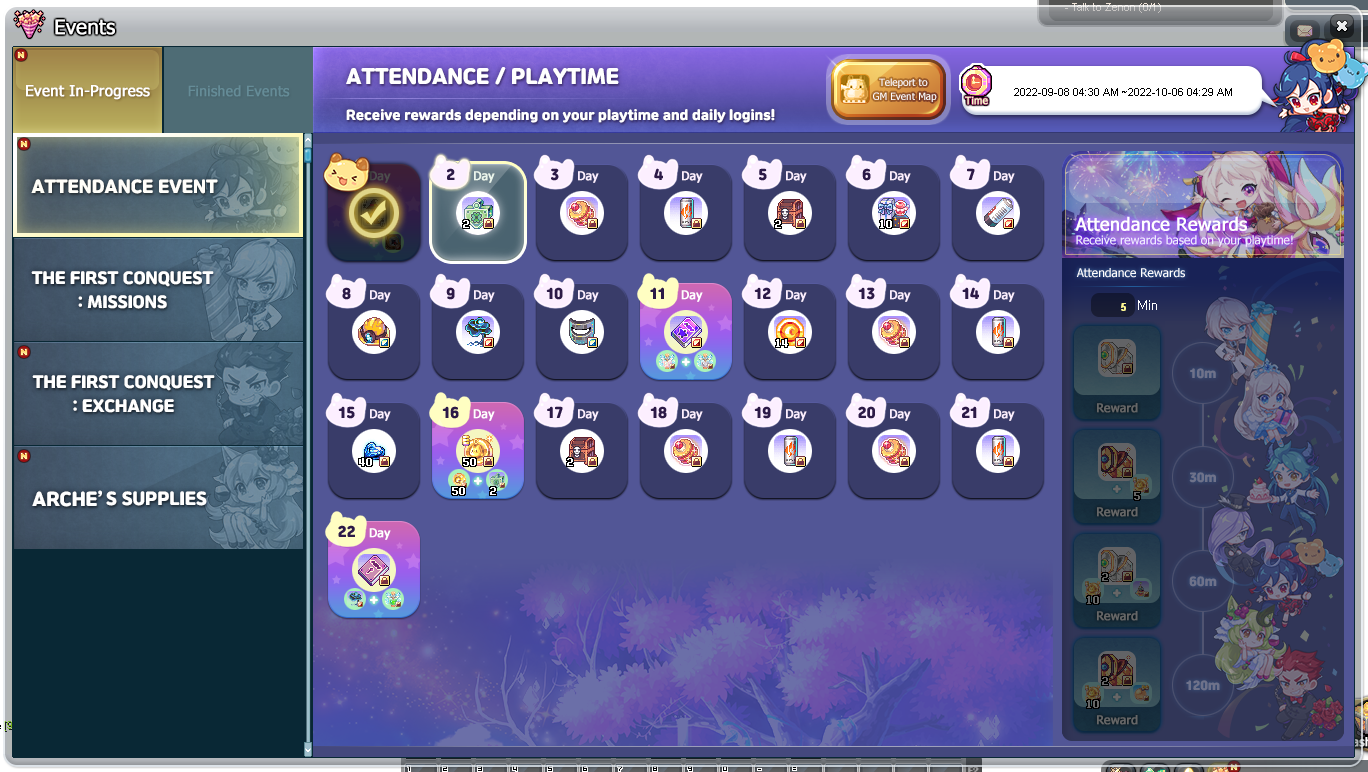 ▷ Attendance / Playtime events will be available on Sept. 8th 04:30 of your local time, while other events will be available on Sept. 8th 00:00 of your local time.